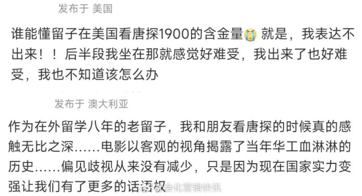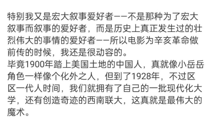 而教育博主@罗淼_吐槽用则被《唐探1900》的宏大叙事打动,尤其这还是历史上真正发生过的壮烈伟大事迹。“毕竟1900年踏上美国土地的中国人,真就像小岳岳角色一样像个化外之人,但到了1928年,不过区区一代人时间,我们就拥有了自己的一批现代化大学,还有创造奇迹的西南联大,这真就是最伟大的魔术。”