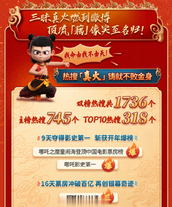 《哪吒2》在海外上映的节奏要更晚一些,但其在全球票房史上突飞猛进的成绩已然是最好的宣传。几天前的破百亿节点,共有159位明星影人发博祝贺,70多家官微齐聚发声,共贺吒儿突破历史。从上映到昨天,《哪吒2》双榜热搜共计1736个,TOP10的热搜达到了318个,这些历史级的数字也还在跟着它的票房不断刷新中。