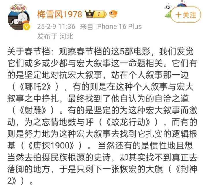 关于春节档的讨论还在持续进行,《哪吒2》票房对文化自信的持续刺激是一方面,另一方面,还是春节档本身就供给了足够多的内容,让观众一直到现在,还有源源不断的讨论热情。即使原本不是电影领域的博主,都会加入到讨论中来。