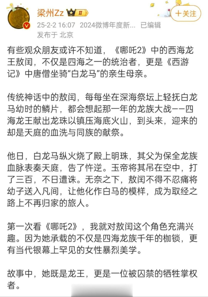 《哪吒2》中最打动读书博主@梁州Zz的角色,是西海龙王敖闰。她的“坏”并非卑躬屈膝的阴谋算计,而是堂堂正正、腰板笔直的反抗。向前走的每一步,都踩在刀刃上,果敢、有勇有谋,甚至比某些正面角色更令人敬畏。这一表达也最终发酵成了热搜“哪吒2敖闰的反派暴烈美学”,让更多人看到了这位亲手书写自己人生剧本的霸气龙女。