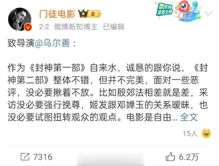 当《封神2》口碑不佳时,着急的粉丝同样是在微博向主创喊话。@门徒电影写下了“封神自来水致乌尔善的一封信”,“遗憾的不止是电影本身,电影特效升级了,电影资金投入肉眼可见,电影依然值得走进影院。但惊艳感却没有了,满腔激情的少年意气也消失了。”乌尔善也在随后的路演现场回应道:“这些批评和建议我们也会认真地思考,用在未来的创作里面,会帮助我们做得更好。”